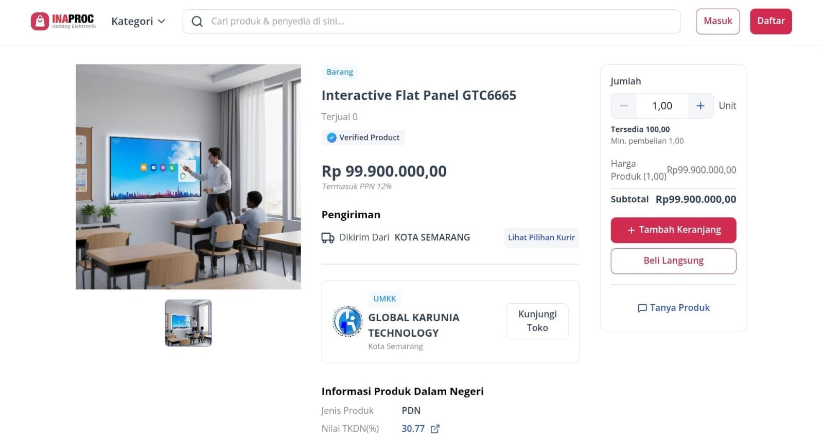 Berdasarkan data mini kompetisi pada sistem e-Katalog, perangkat smartboard yang disediakan memiliki rincian spesifikasi sebagai berikut: Tipe Produk GTC0365.