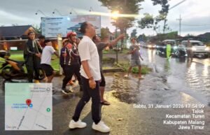 Malang, pendoposatu.id — Intensitas hujan sedang hingga deras yang disertai angin kencang sejak siang hari menyebabkan sebuah pohon besar tumbang dan menghambat arus lalu lintas di Jalan Raya Hamid Rusdi Talok, tepatnya di depan Rest Area Lumba-Lumba, Kecamatan Turen, Kabupaten Malang, Sabtu (31/1/2026) sore.