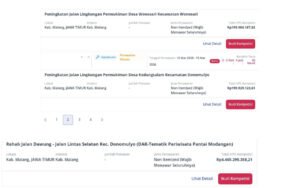 Sementara itu, pada DPKPCK juga terdapat paket pekerjaan yang menggunakan skema serupa. Di antaranya peningkatan jalan lingkungan permukiman di Desa Wonosari, Kecamatan Wonosari, dengan HPS Rp199.980.187,82, serta paket peningkatan jalan lingkungan permukiman di Desa Kedungsalam, Kecamatan Donomulyo.